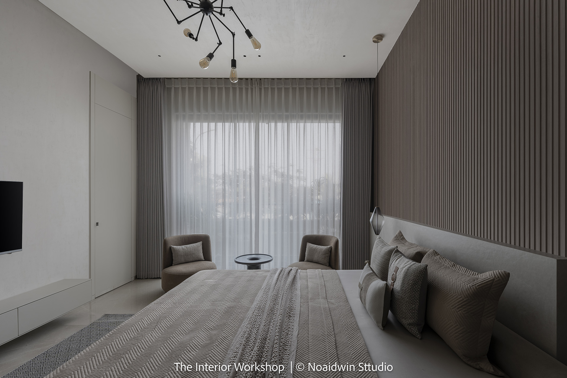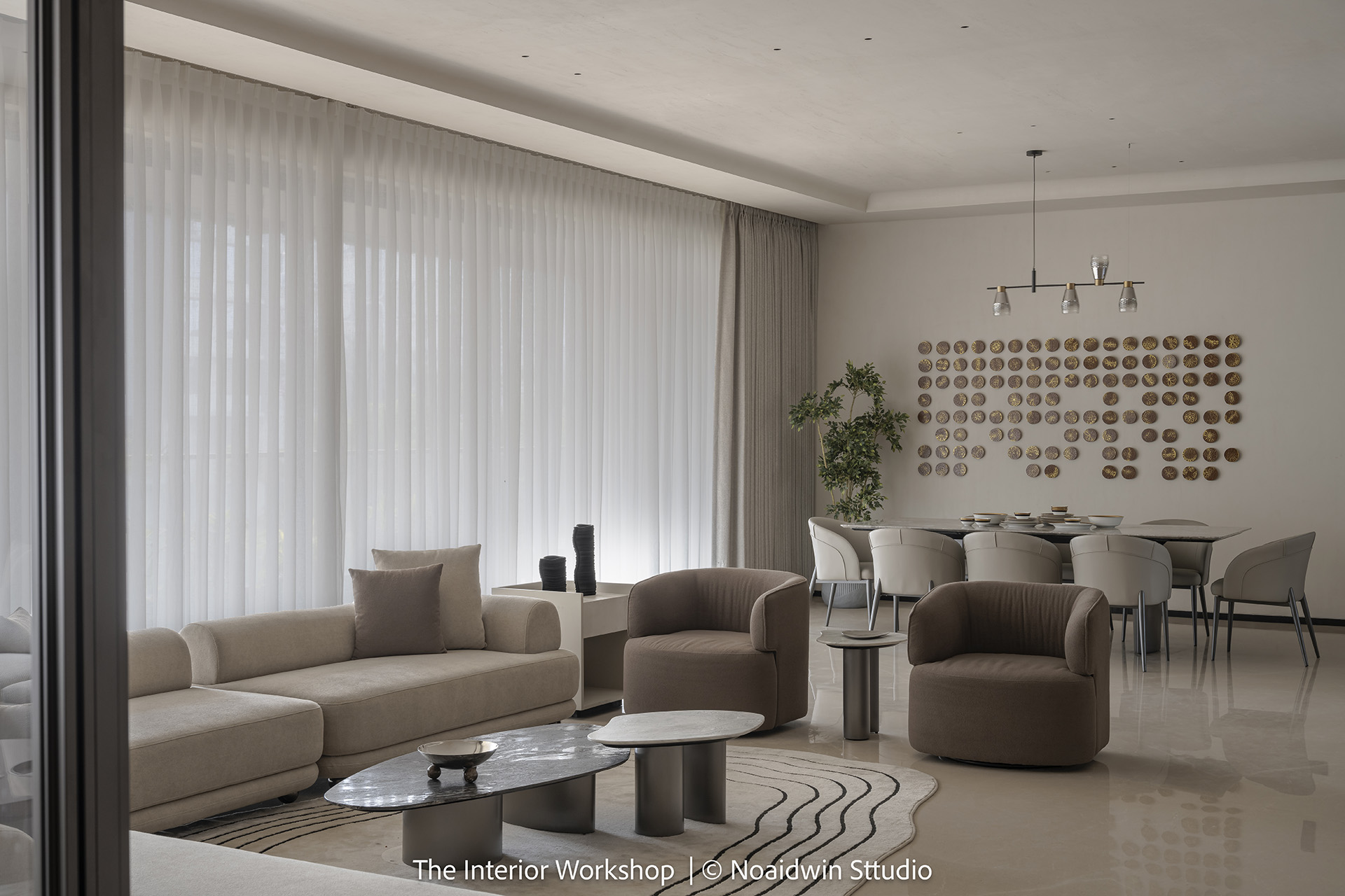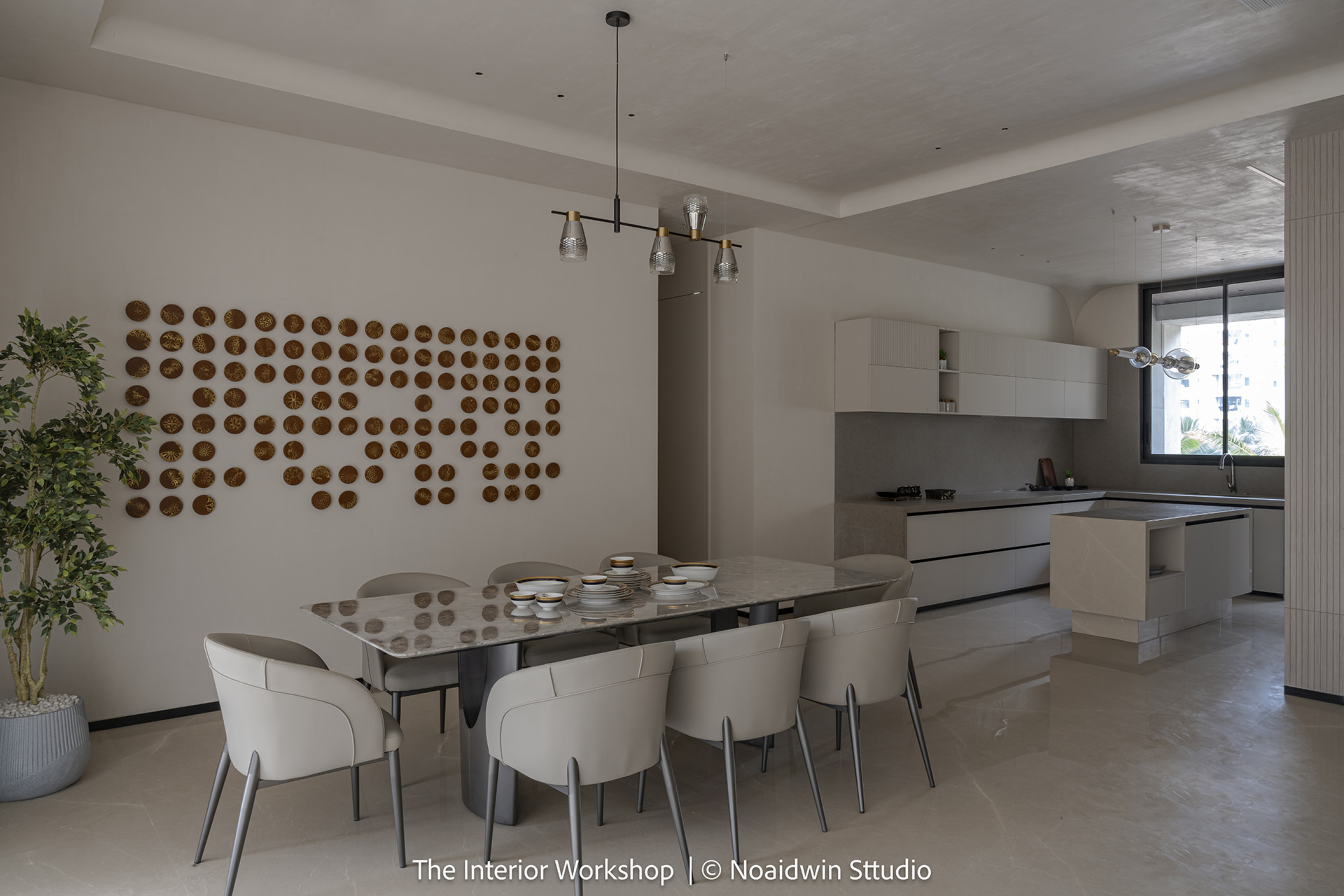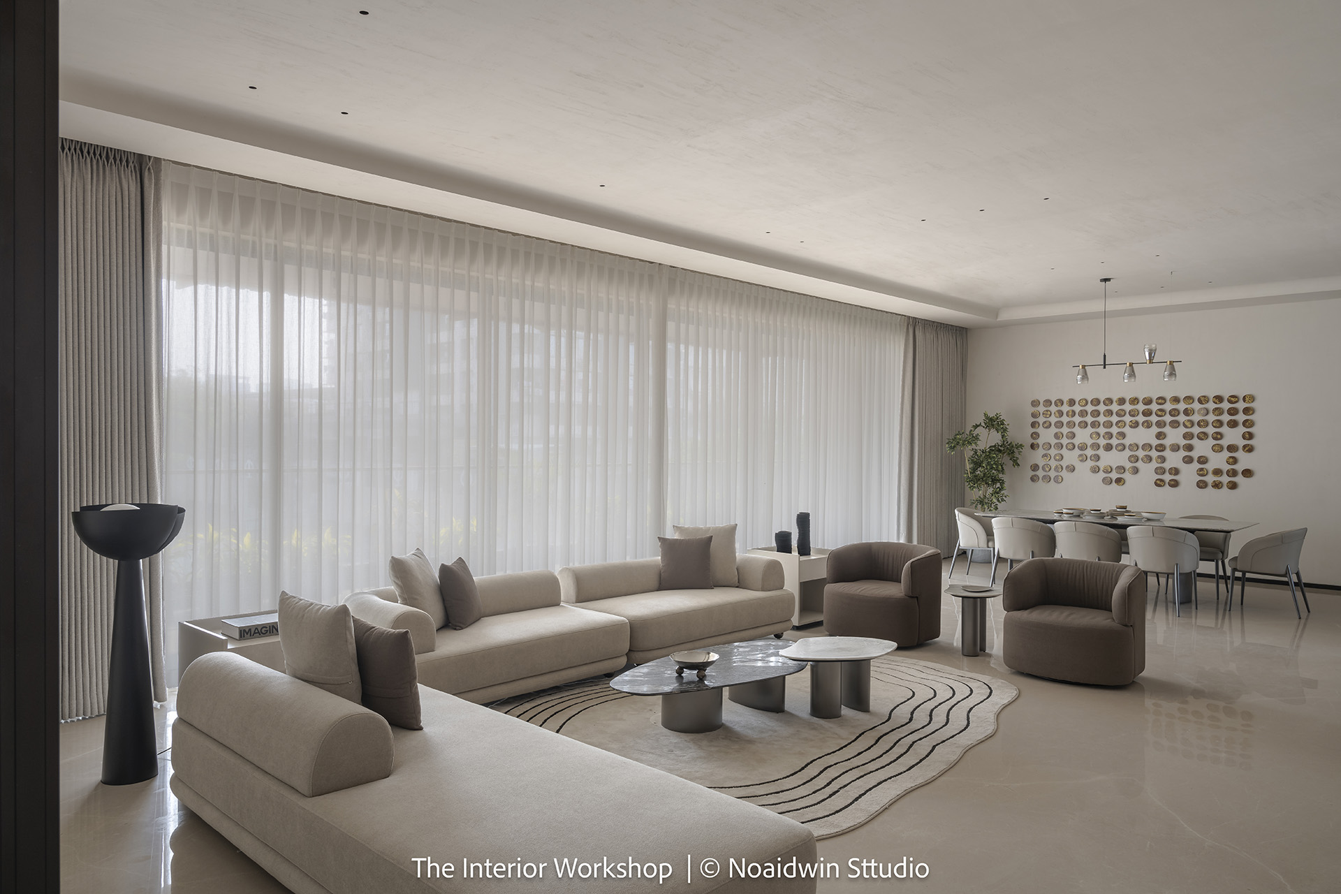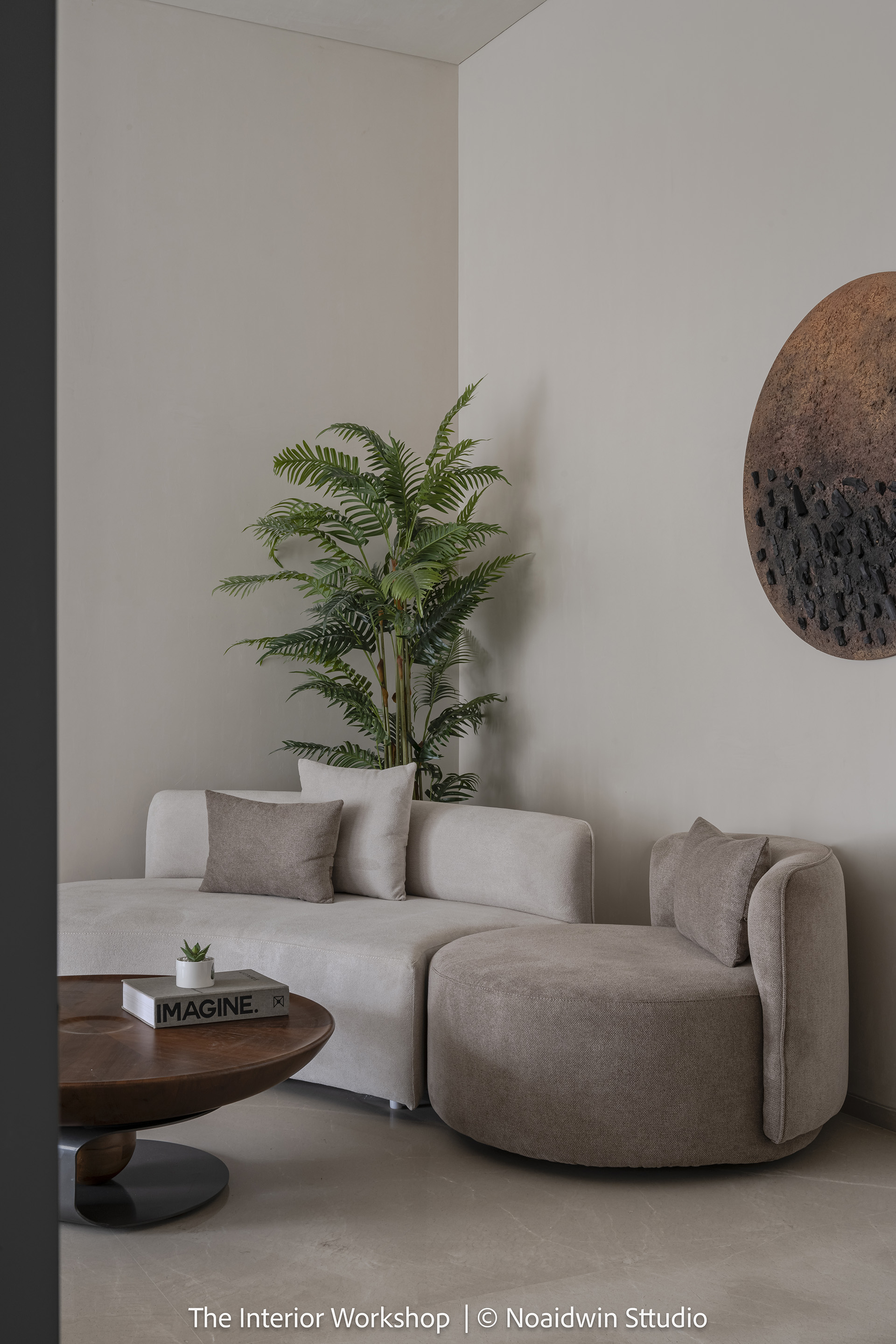The design also incorporates ample natural light, softened by wooden blinds that offer both privacy and style. The chandelier, with its unique design, adds a sculptural element to the space, elevating the overall aesthetic. This project is a testament to The Interior Workshop mastery in crafting spaces that blend elegance with comfort.