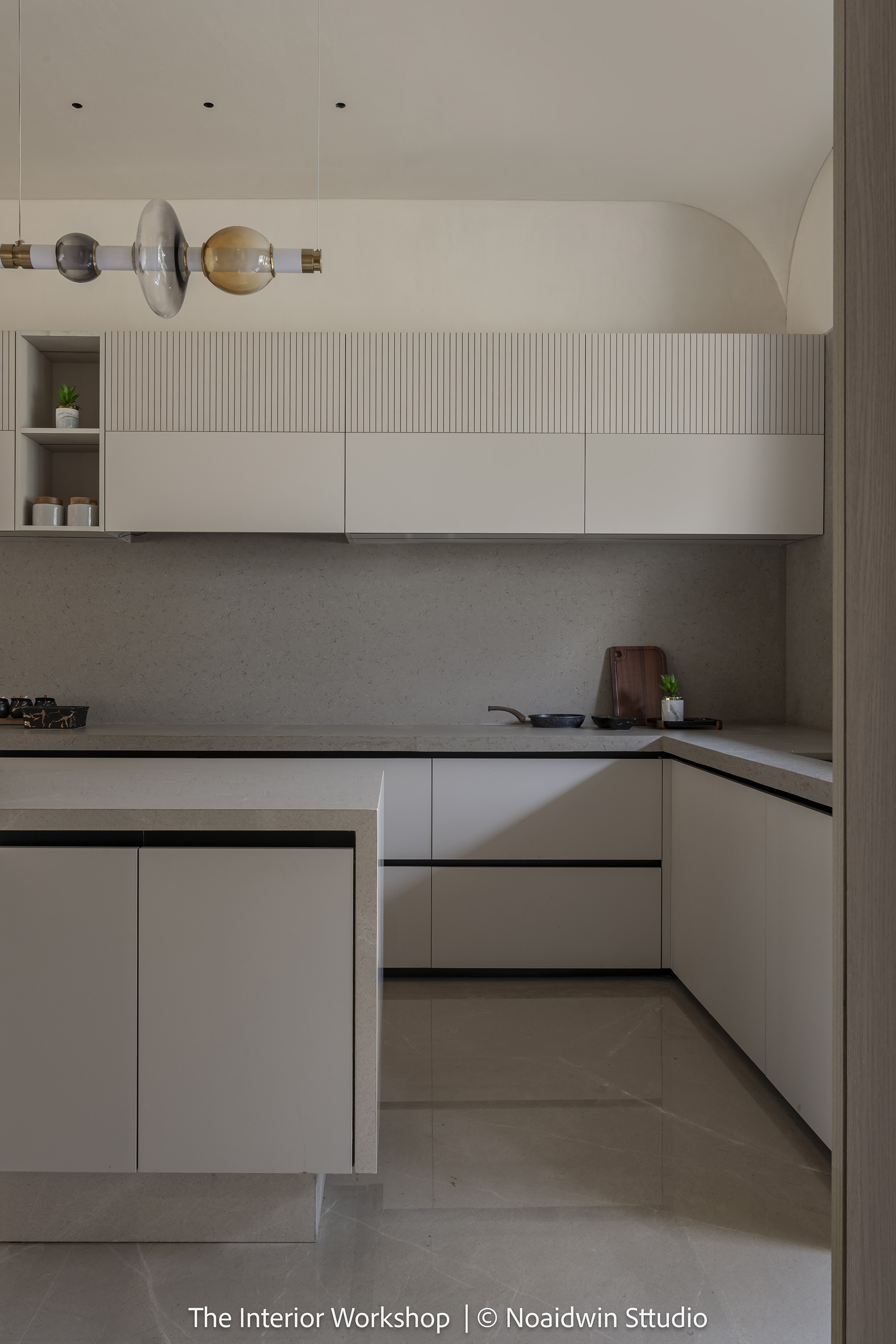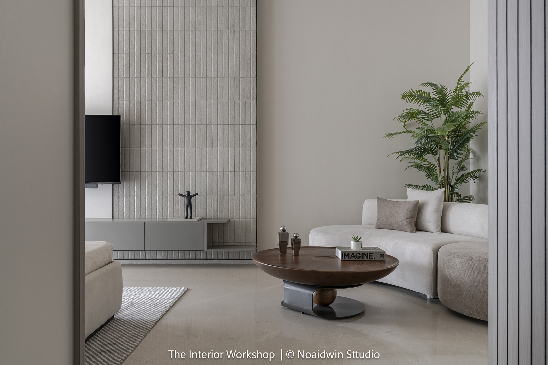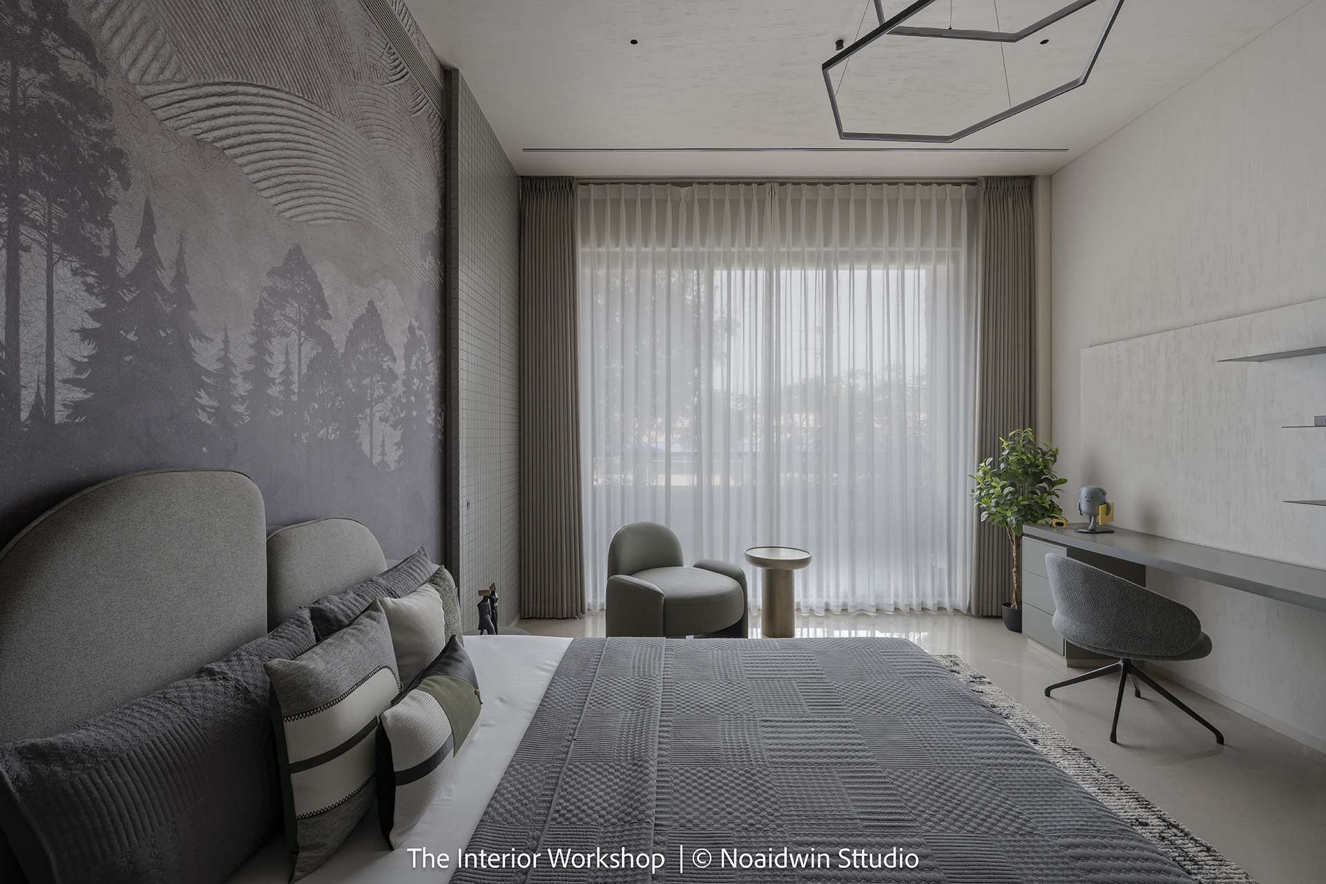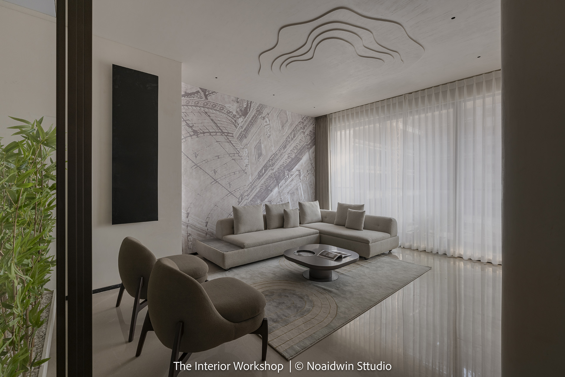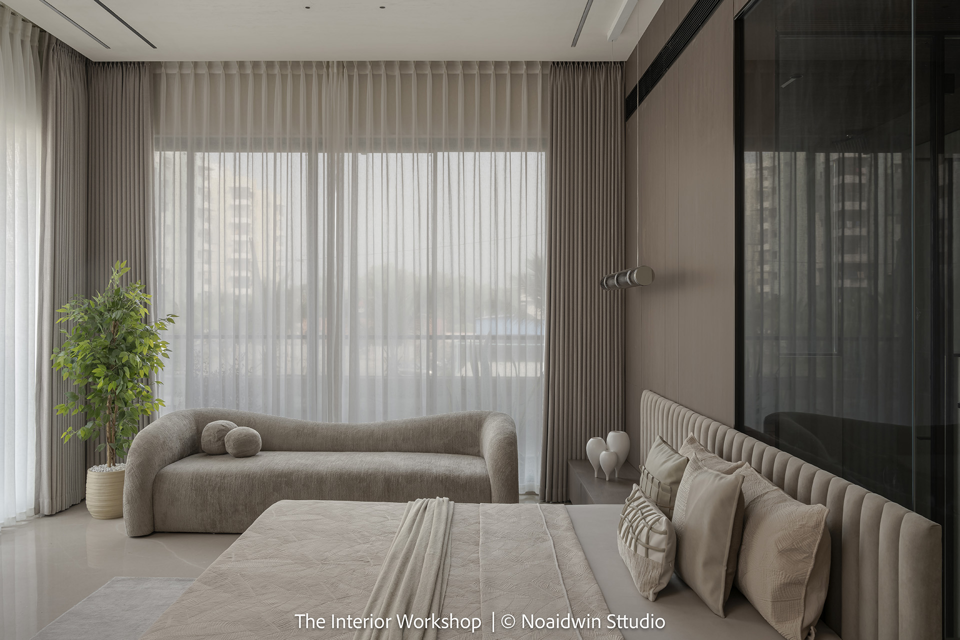 The design also incorporates ample natural light, softened by wooden blinds that offer both privacy and style. The chandelier, with its unique design, adds a sculptural element to the space, elevating the overall aesthetic. This project is a testament to The Interior Workshop mastery in crafting spaces that blend elegance with comfort.