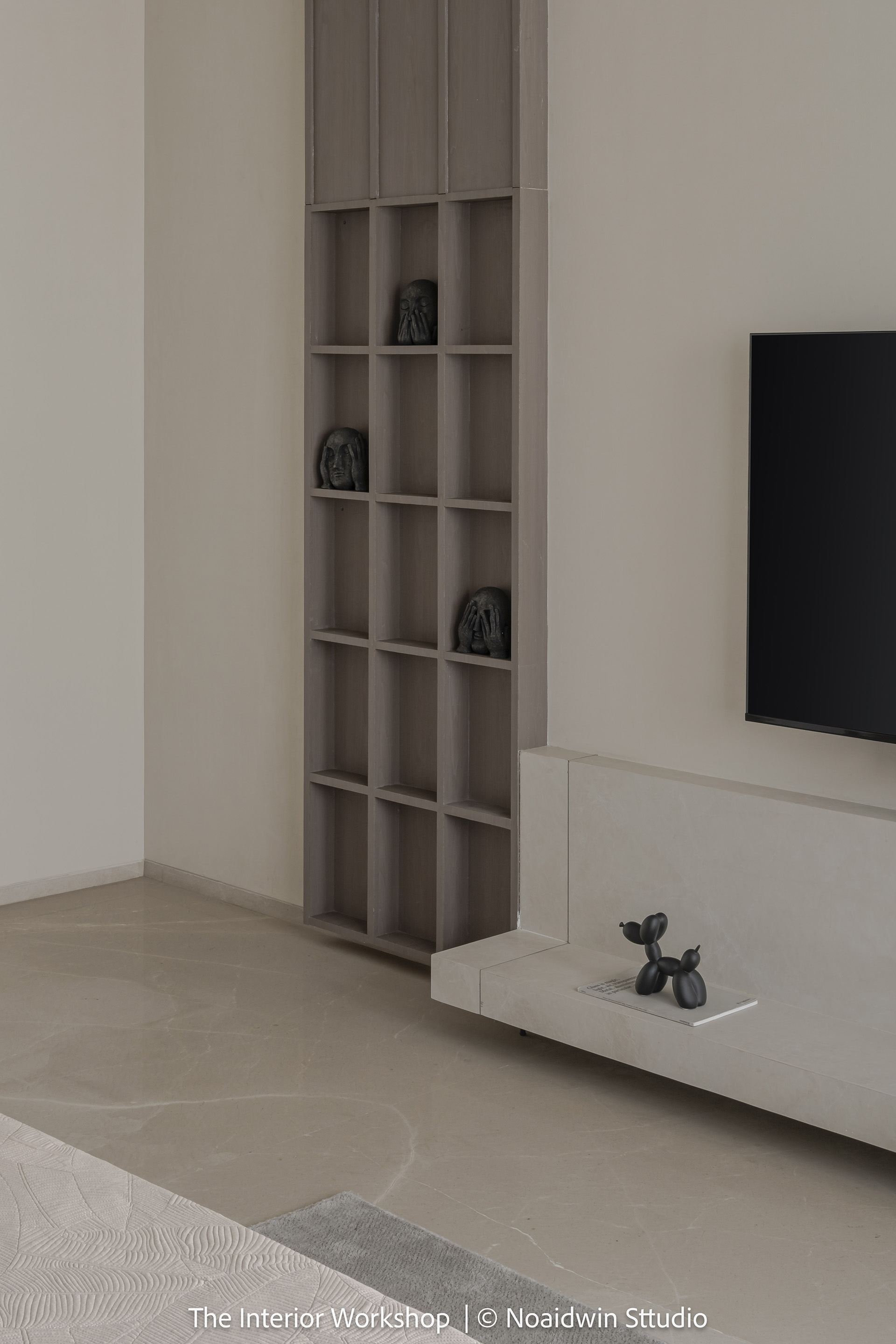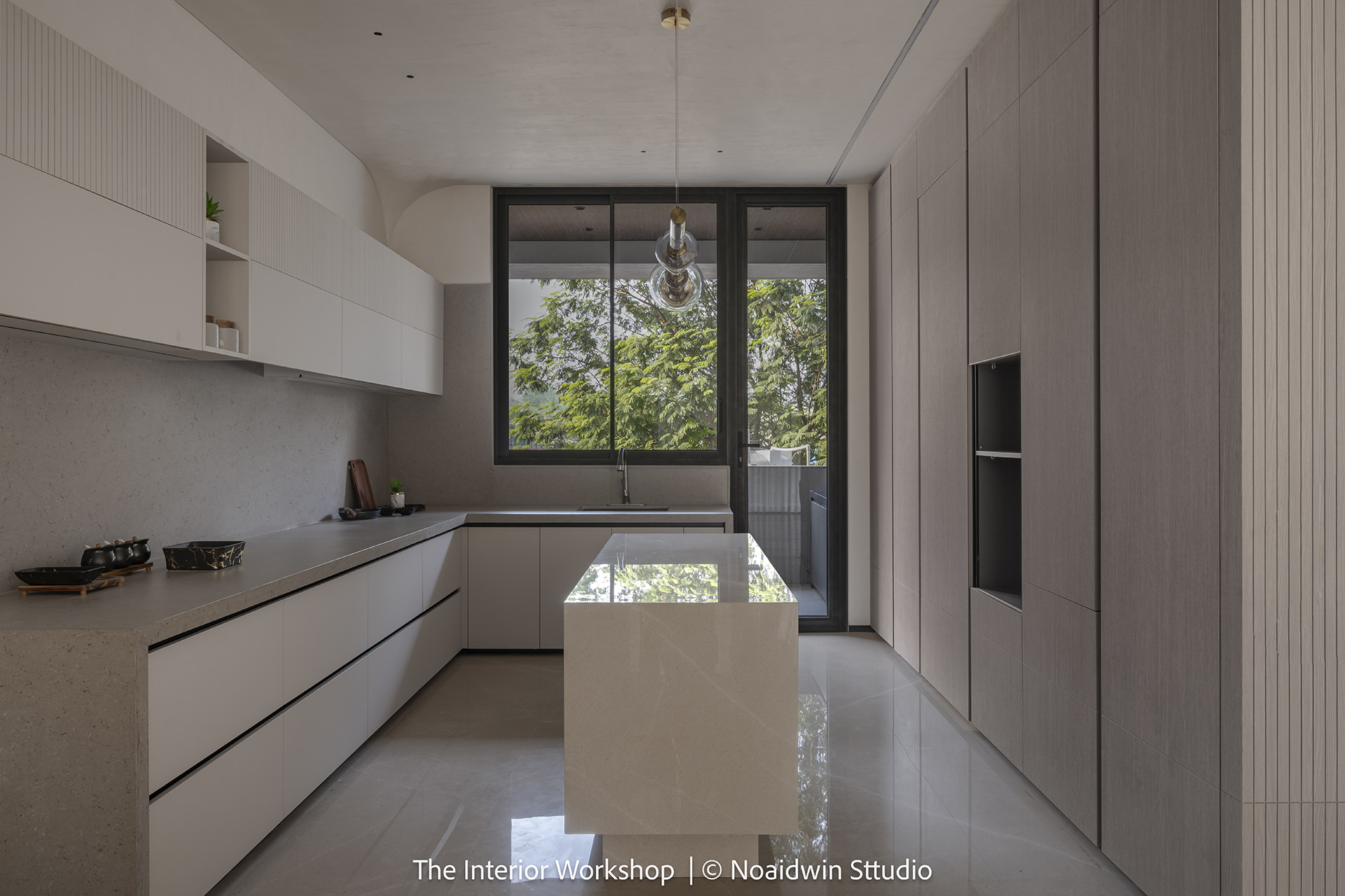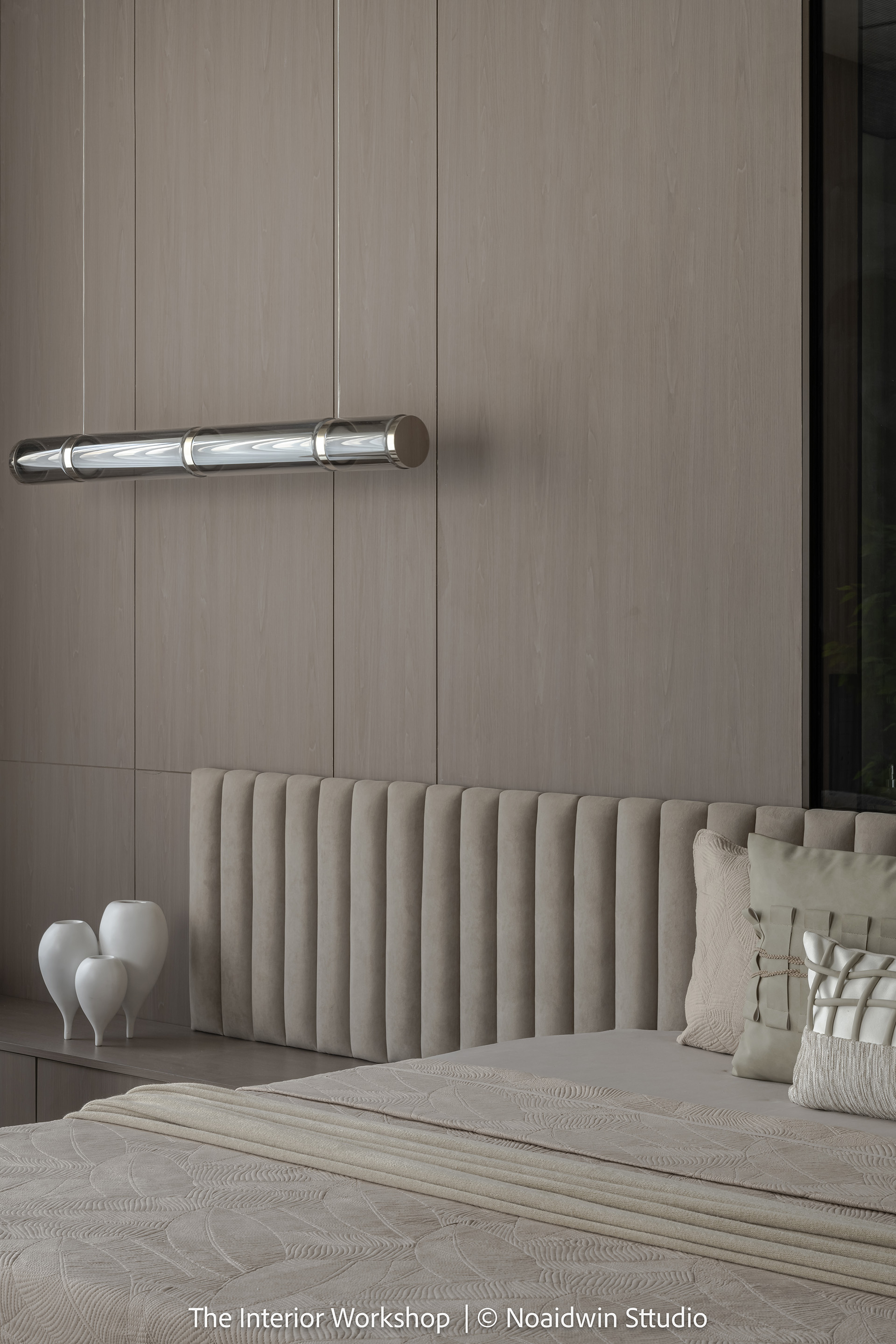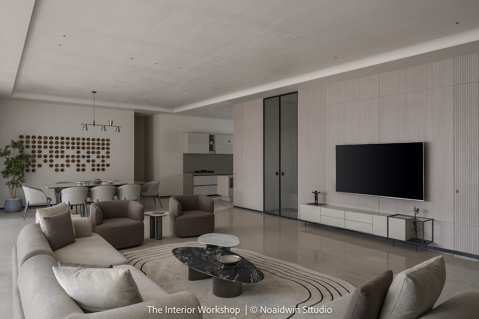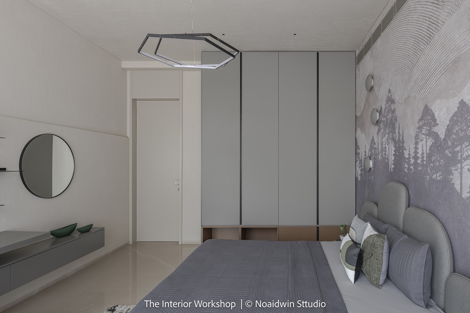 The design also incorporates ample natural light, softened by wooden blinds that offer both privacy and style. The chandelier, with its unique design, adds a sculptural element to the space, elevating the overall aesthetic. This project is a testament to The Interior Workshop mastery in crafting spaces that blend elegance with comfort.