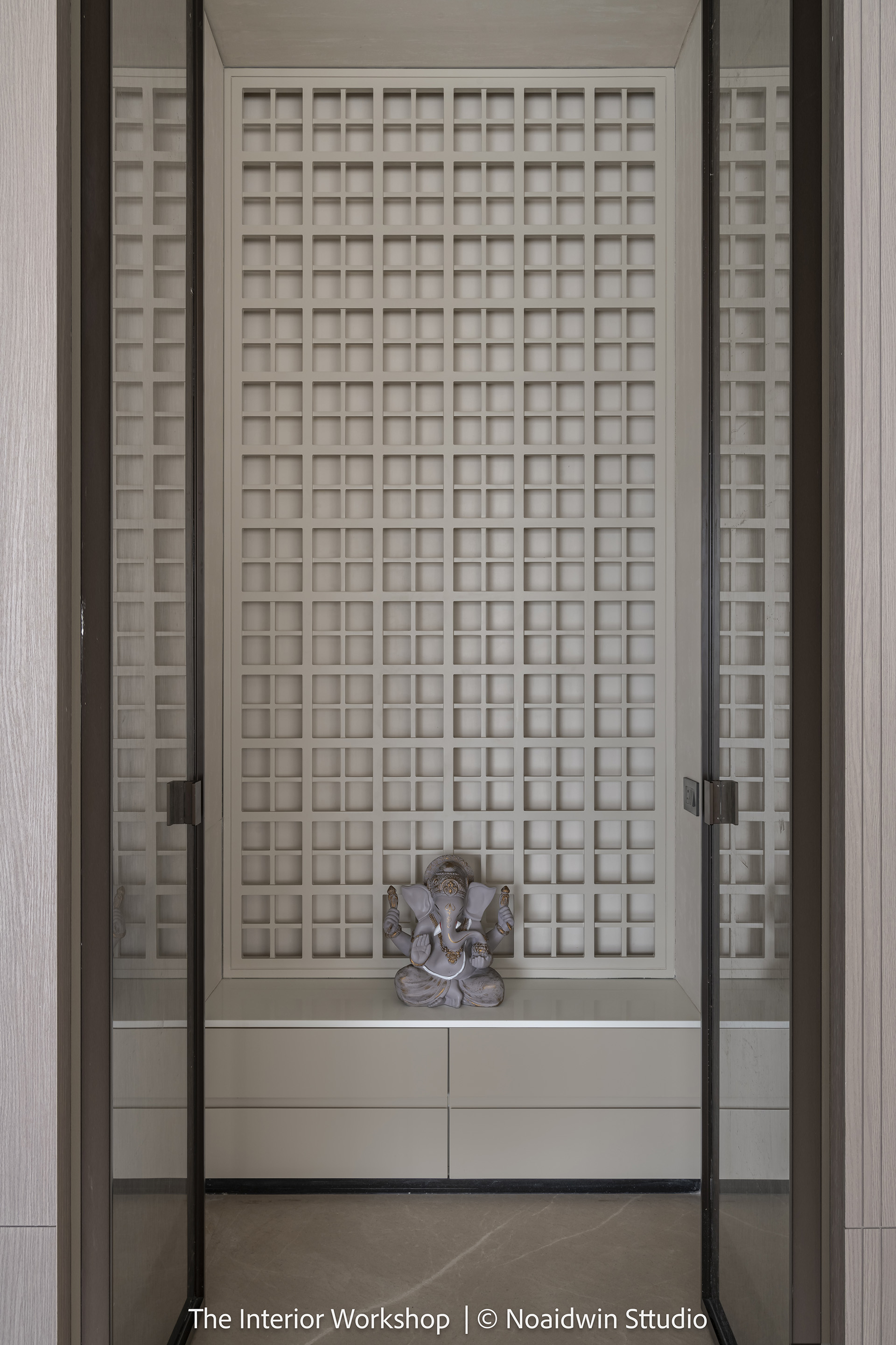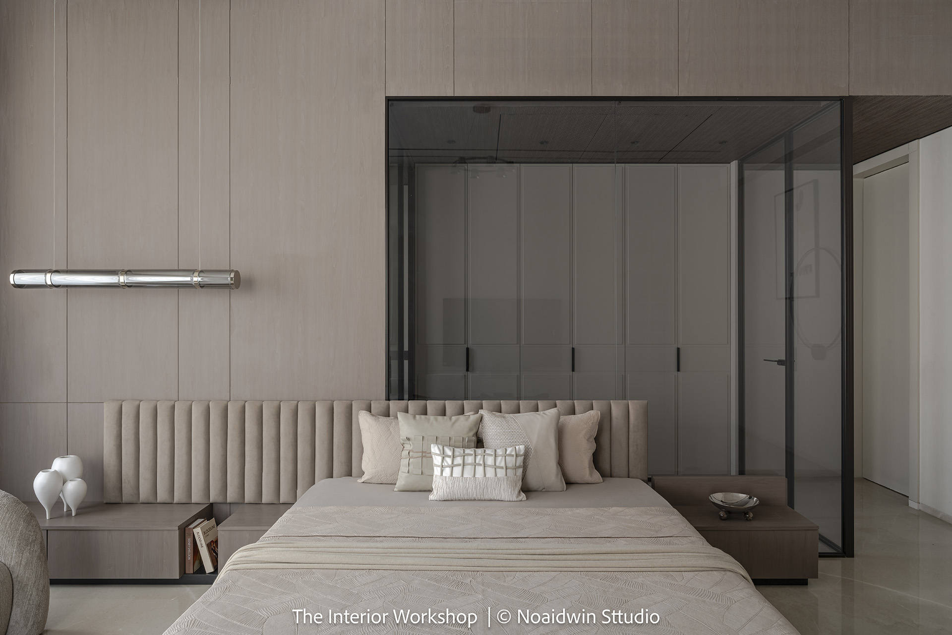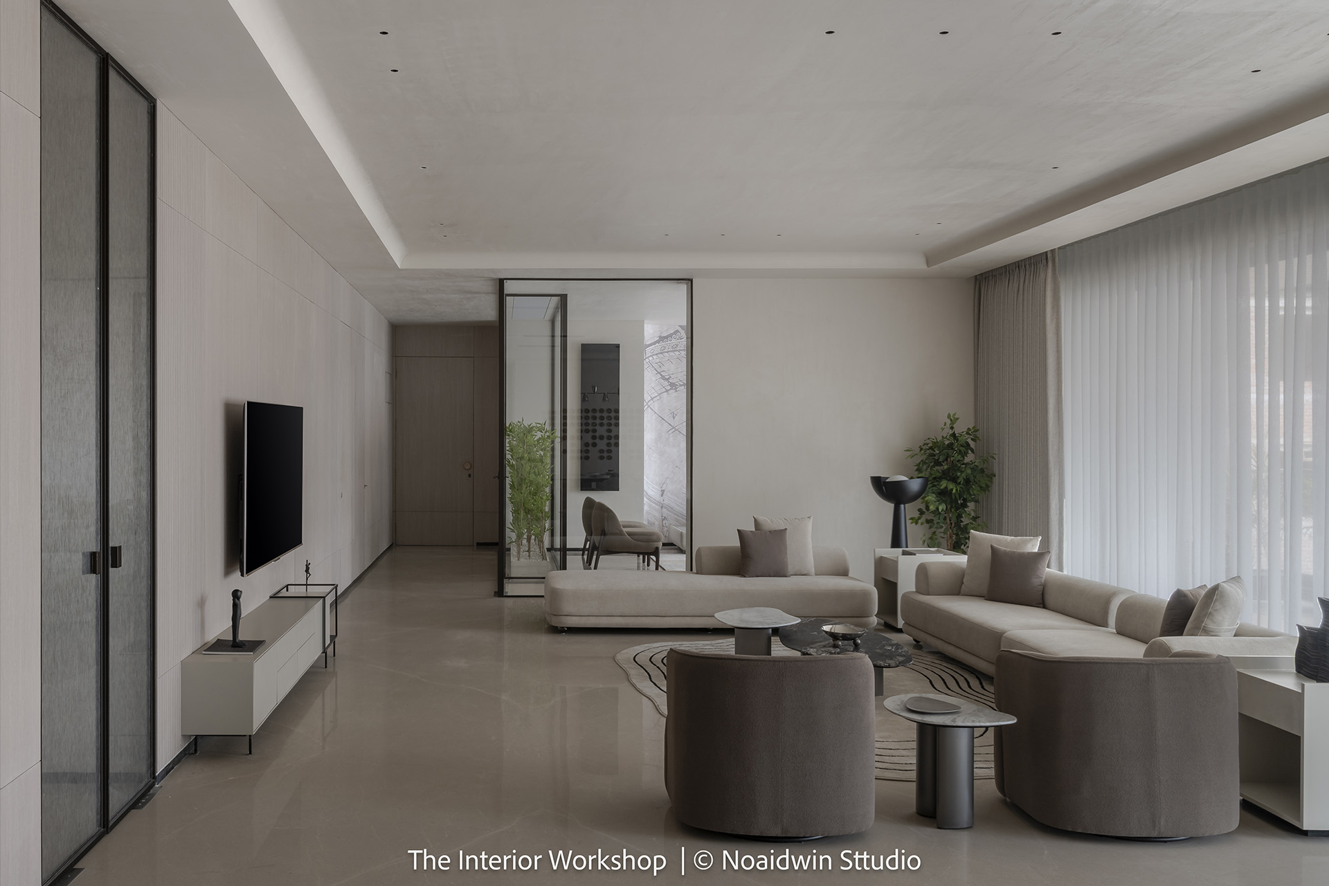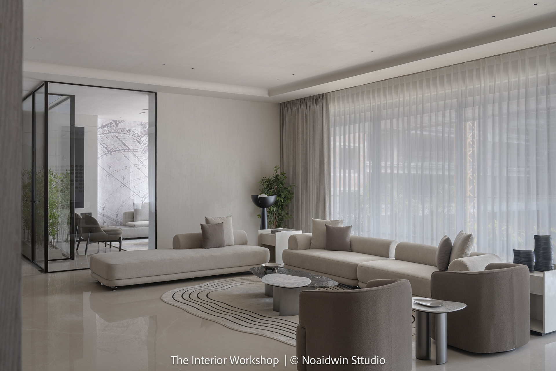 The design also incorporates ample natural light, softened by wooden blinds that offer both privacy and style. The chandelier, with its unique design, adds a sculptural element to the space, elevating the overall aesthetic. This project is a testament to The Interior Workshop mastery in crafting spaces that blend elegance with comfort.