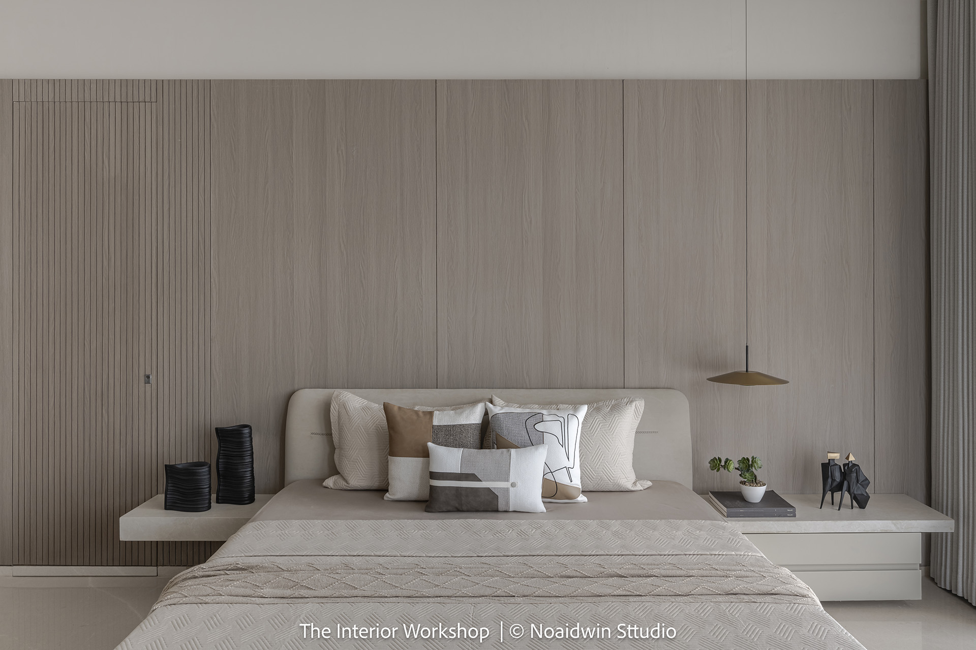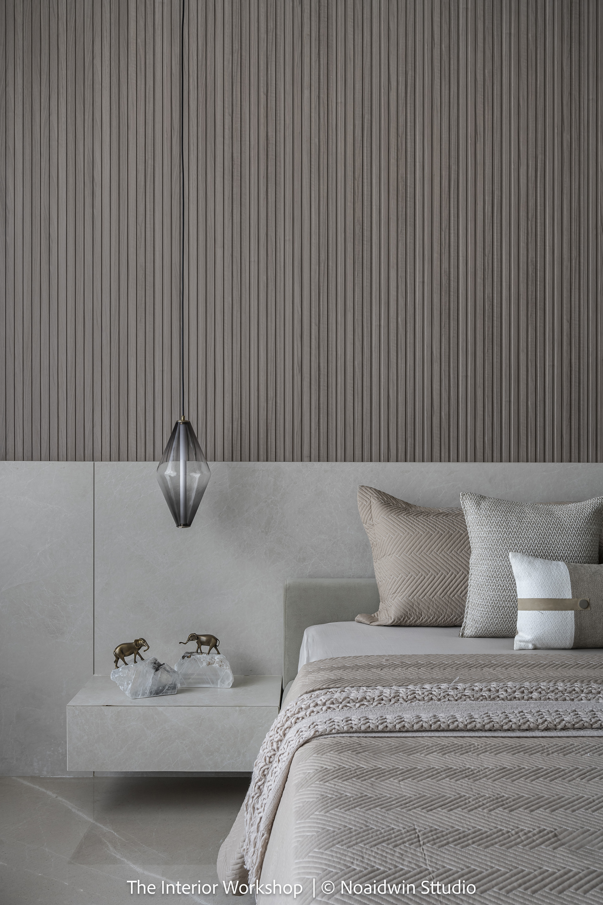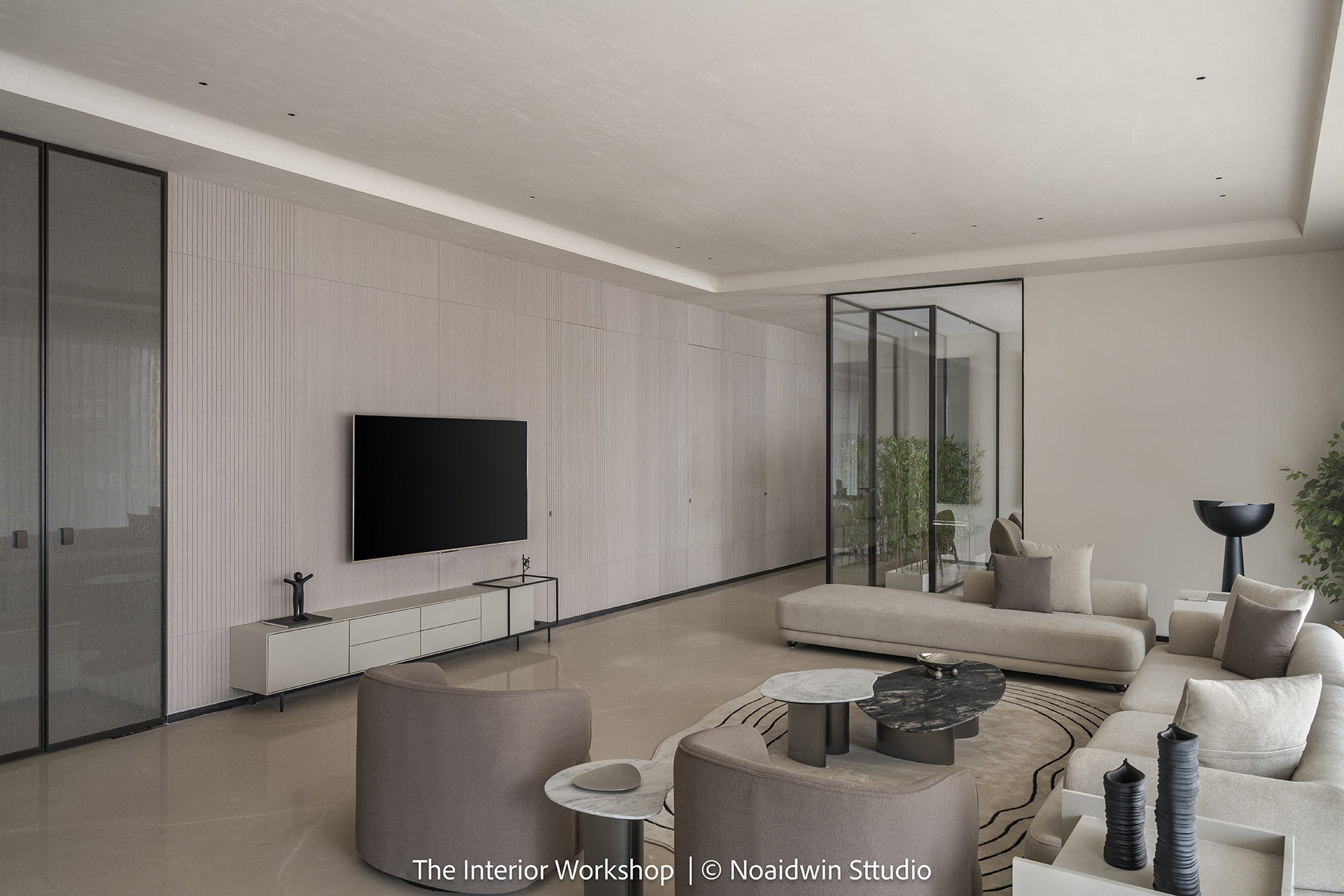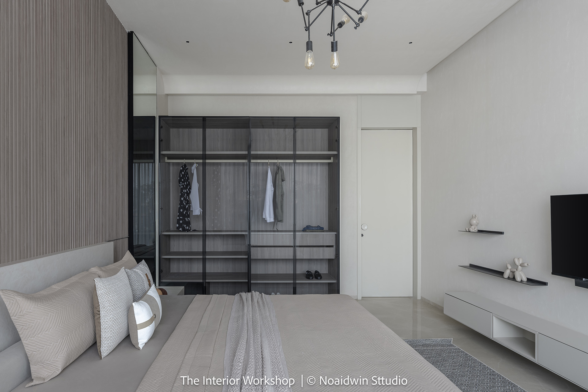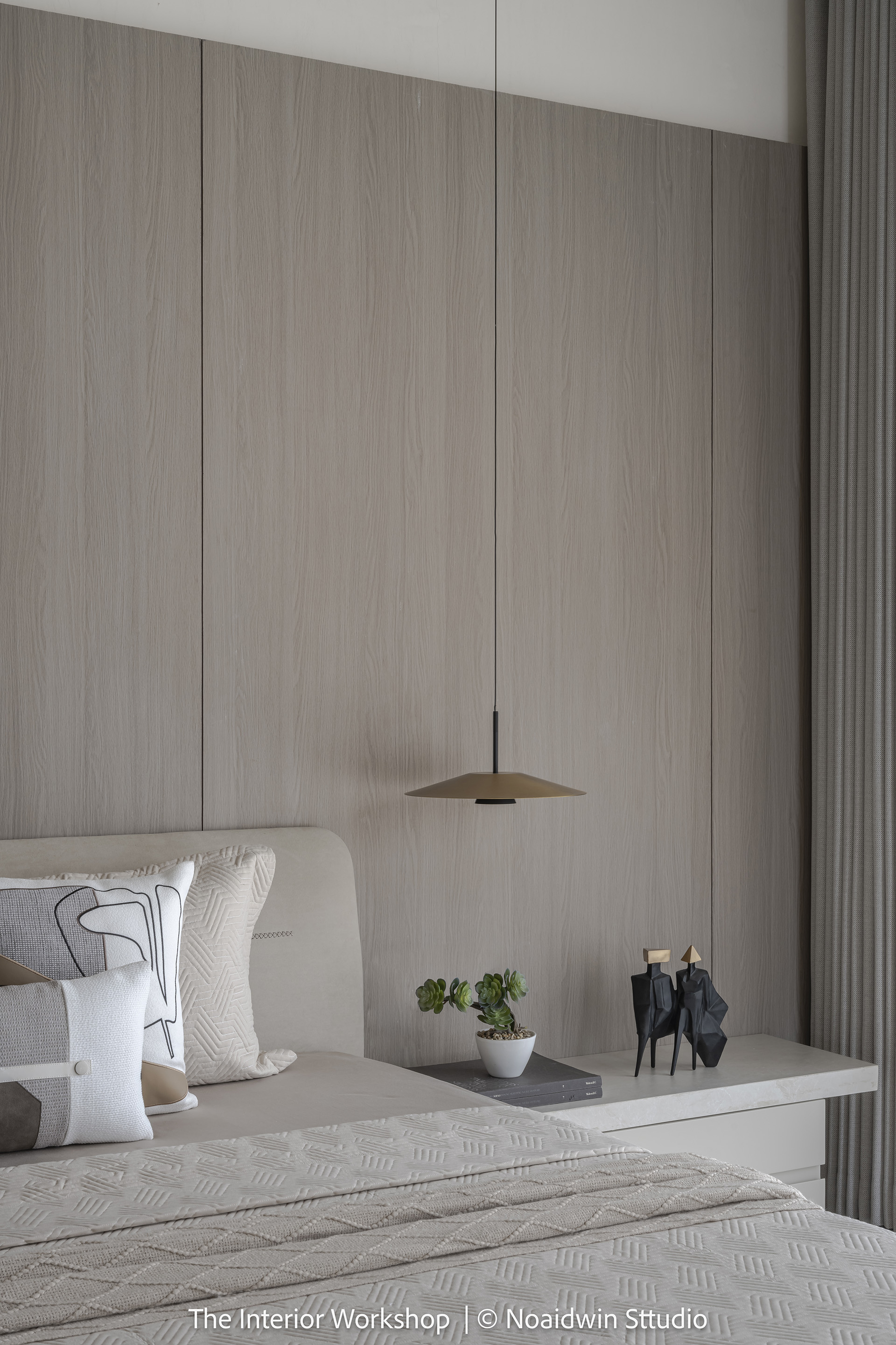 The design also incorporates ample natural light, softened by wooden blinds that offer both privacy and style. The chandelier, with its unique design, adds a sculptural element to the space, elevating the overall aesthetic. This project is a testament to The Interior Workshop mastery in crafting spaces that blend elegance with comfort.