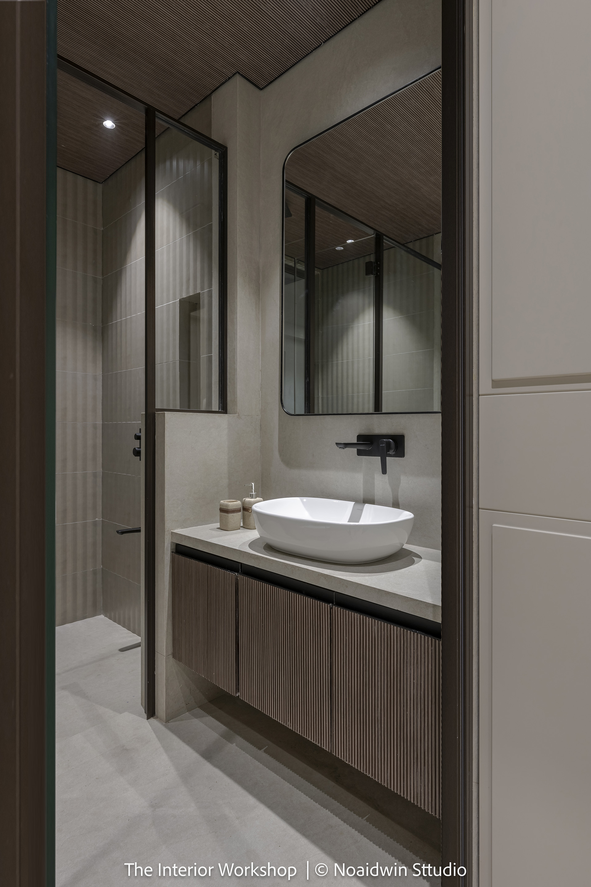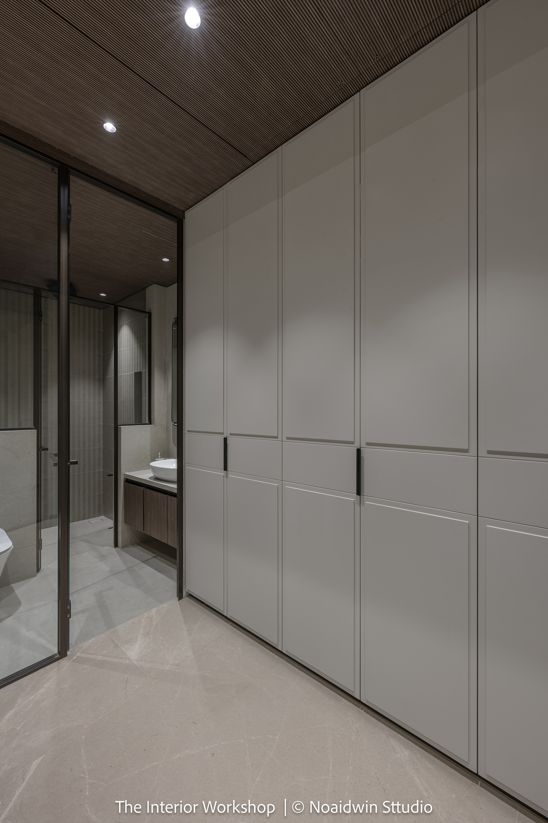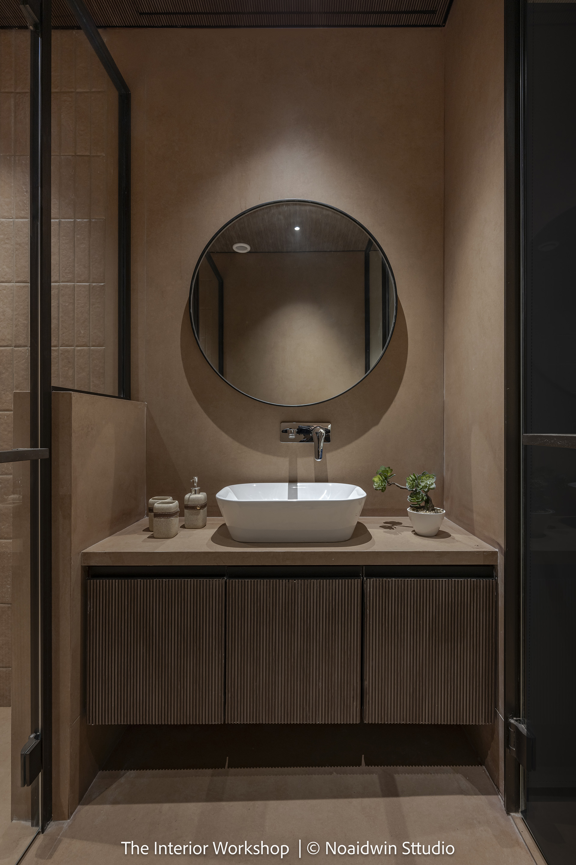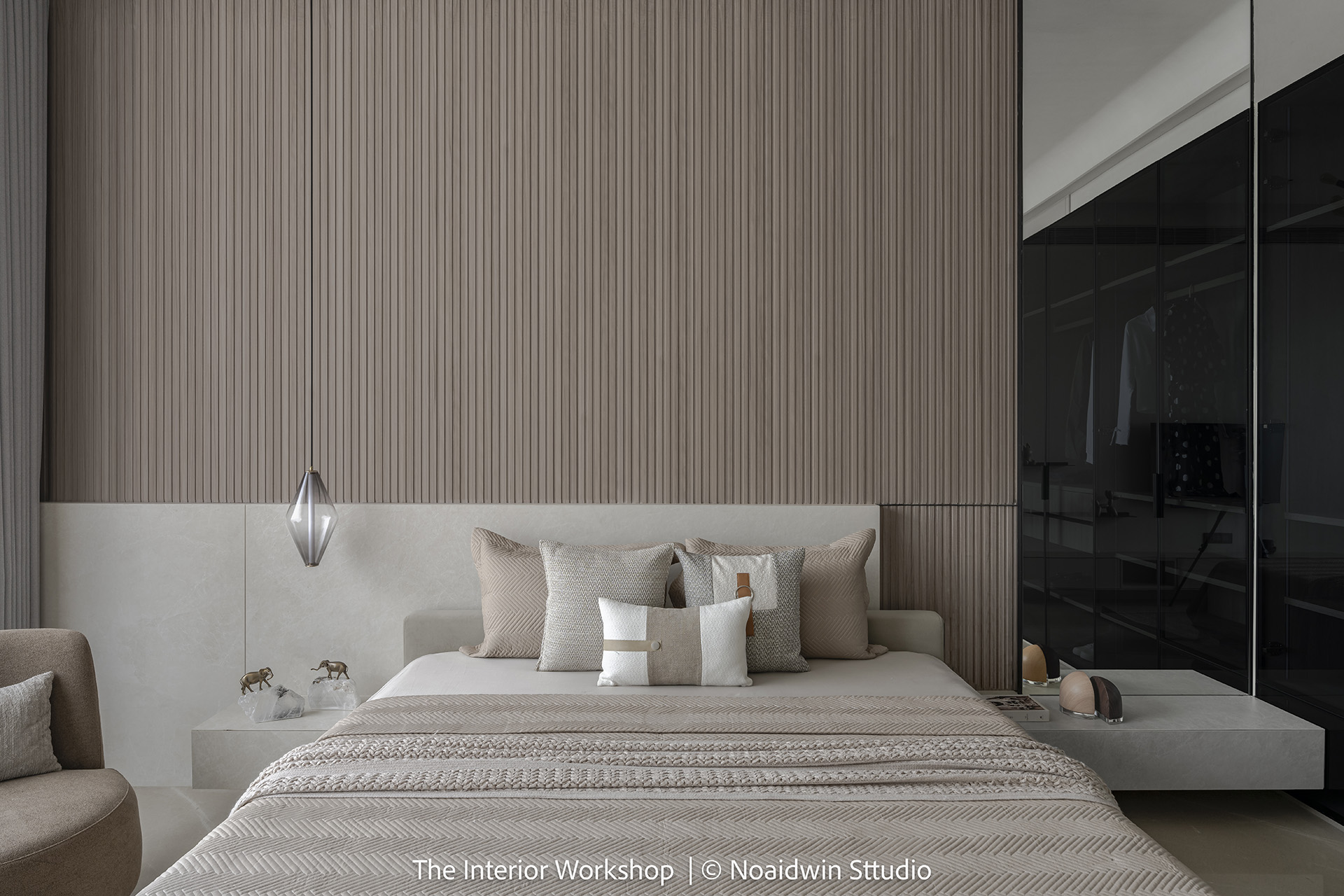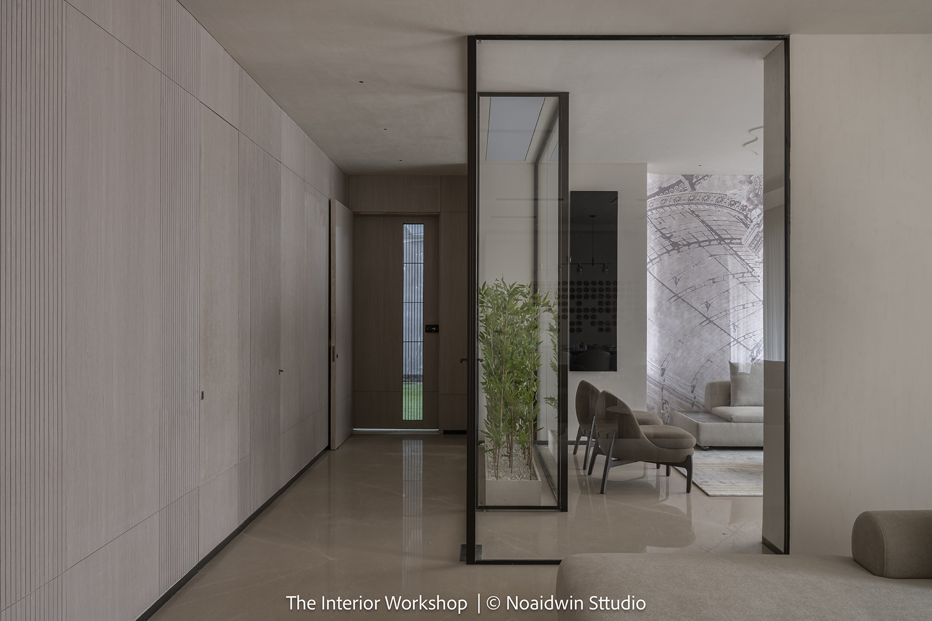 The design also incorporates ample natural light, softened by wooden blinds that offer both privacy and style. The chandelier, with its unique design, adds a sculptural element to the space, elevating the overall aesthetic. This project is a testament to The Interior Workshop mastery in crafting spaces that blend elegance with comfort.