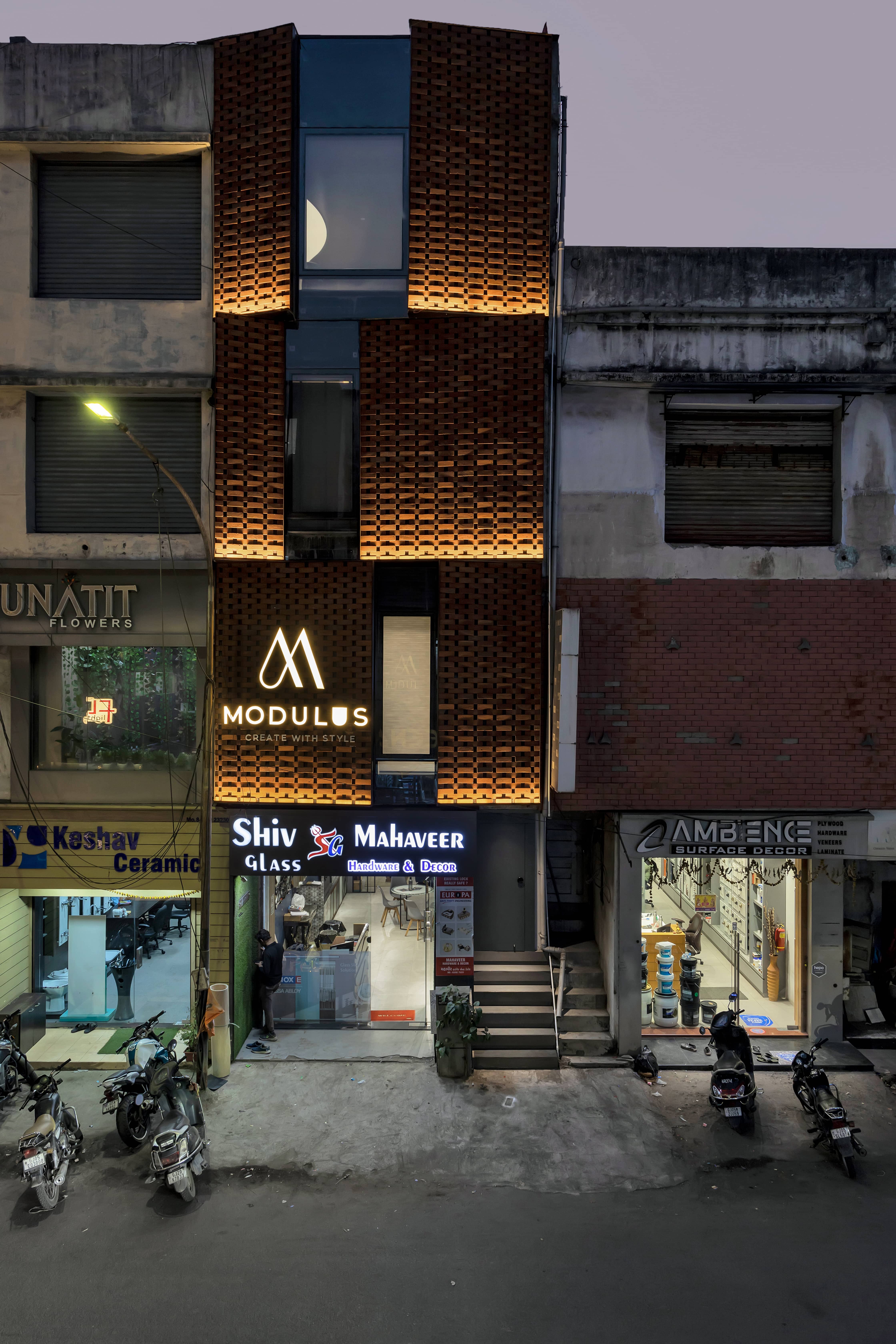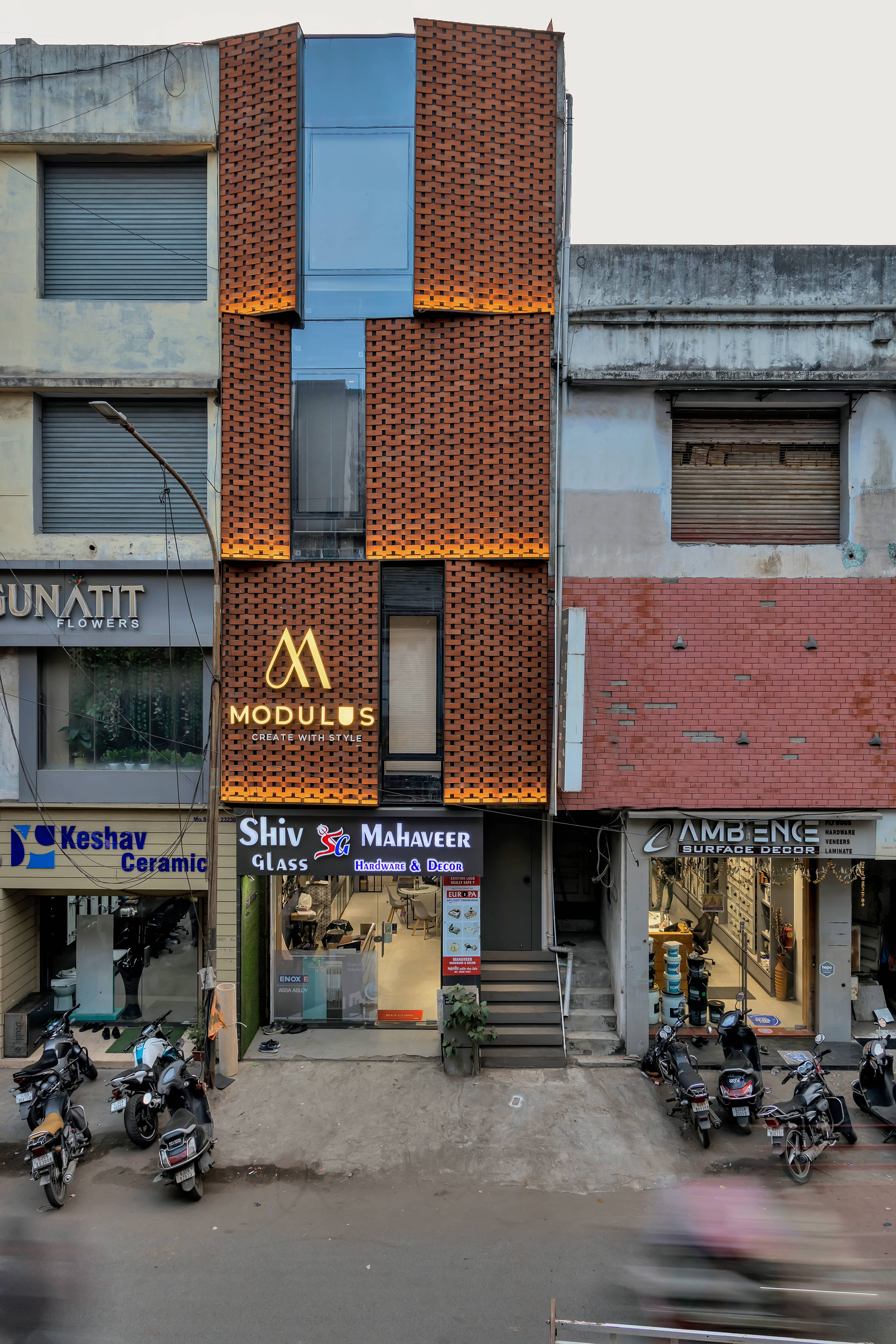 The three-story structure successfully integrates innovative facade design with thoughtfully planned interiors, establishing Modulus as a landmark commercial development in Surat.