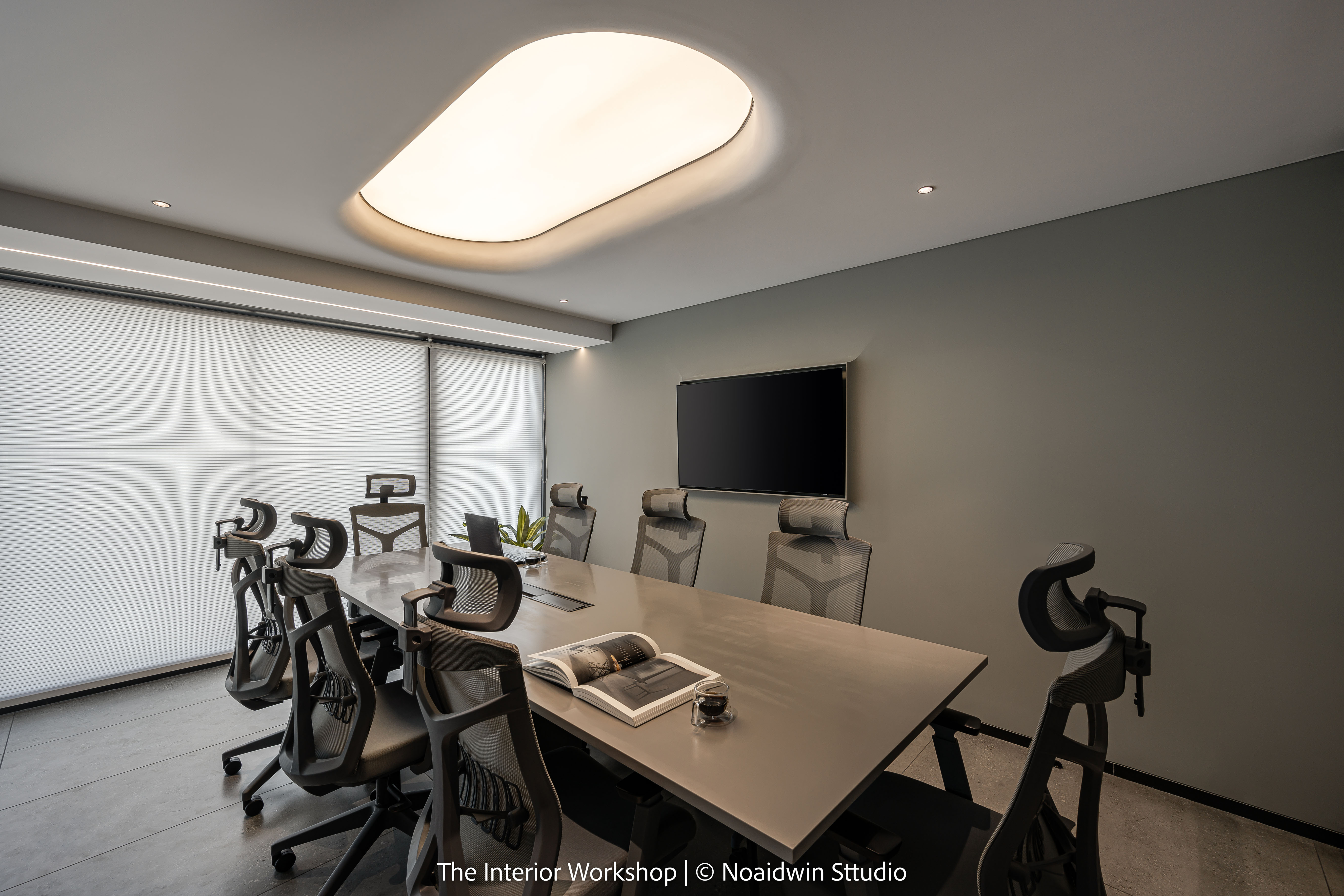 Step into our conference room, a nucleus of creativity and cooperation. Here, a fabric ceiling gracefully hangs above, elegantly supported by minimalistic walls and furniture.